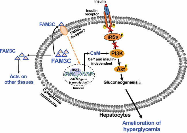 In conclusion, FAM3C is a new hepatokine that activates HSF1-CaM-Akt pathway to ameliorate hyperglycemia of type 1 diabetic mice by suppressing hepatic gluconeogenesis in an insulin-independent manner (Figure 9). FAM3C-HSF1 axis is the potential target for the treatment of type 1 and type 2 diabetes.