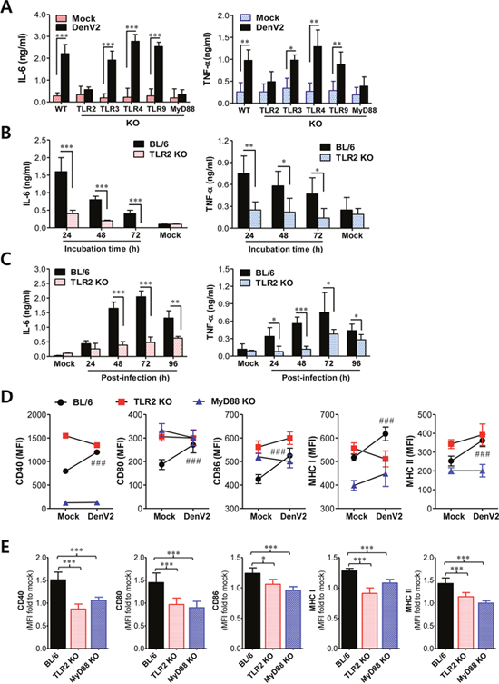 Figure 1: TLR2/MyD88 pathway is required for recognition of dengue virus infection. (A) Dependence of IL-6 and TNF-α production on TLR2/MyD88 pathway in DCs infected with DenV. BMDC from wild-type BL/6, TLR2, 3, 4, 9, or MyD88 KO mice were infected with DenV2 (5.0 moi), after which cytokine levels in culture supernatants were determined by ELISA at 48 h pi. (B) Ex vivo secretion of IL-6 and TFN-α from splenocytes of BL/6 and TLR2 KO mice. Splenocytes from BL/6 and TLR2 KO mice i.p. infected with DenV2 (1×106 ffu/mouse) were prepared at 48 h pi. Cytokine levels in culture supernatants were determined at indicated time after starting culture of splenocytes. (C) Levels of IL-6 and TNF-α in sera of BL/6 and TLR2 KO mice following DenV infection. Cytokine levels in sera collected at indicated times were determined by ELISA. (D) Dependence of phenotypic changes of Ag presentation-related markers on TLR2/MyD88 pathway in DenV2-infected DCs. BMDC derived from BL/6, TLR2 KO, and MyD88 KO mice were infected with DenV2 (5.0 moi) and used to stain activation markers at 24 h pi. (E) MFI ratio of phenotype markers to mock-infected DCs. Data denote the average ± SE of cytokines or MFI levels obtained from three independent experiments. *, p < 0.05; **, p < 0.01; ***, p < 0.001 compared with levels in the indicated group; ###, p < 0.001 compared with levels in mock-infected BL/6 mice.