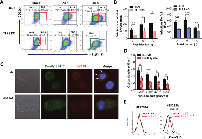 Figure 2: TLR2 molecule facilitates infection of DenV in DCs. (A) Infection frequency of BMDCs derived from BL/6 and TLR2 KO mice. BMDCs derived from wild-type BL/6 and TLR2 KO mice were infected with DenV2 (5.0 moi). Infected and uninfected BMDCs were distinguished by co-staining with surface CD11c and intracellular DenV NS1 proteins at indicated time points. Values in representative dot plots denote the average percentage ± SE of indicated DN3- or DN3+ cells in three independent experiments. (B) Multiplication of DenV2 in BMDCs derived from BL/6 and TLR2 KO mice. BMDCs derived from BL/6 and TLR2 KO mice were infected with DenV2 (1.0 moi). DenV2 replication was evaluated by real-time qRT-PCR and focus-forming assay using total RNA extracted from infected cells and culture supernatants, respectively. (C) Confocal microscopy of DenV2 Ag and TLR2 molecules in BL/6 and TLR KO BMDCs following DenV infection. BL/6 and TLR2 KO BMDCs infected with DenV2 (5.0 moi) were co-stained for DenV2 E antigen (green), TLR2 molecule (red), and nuclear stain DAPI (blue) at 24 h pi. Pictures represent at least five slides. (D) Binding of DenV2 virion to TLR2 molecule. DenV2 and lysate of C6/36 mosquito cells were prepared and used for examining their binding ability to TLR2 molecule. The binding ability of DenV2 to TLR2 molecules was evaluated by ELISA using mouse TLR2-fused human IgG Fc (TLR2-Fc) chimerical protein. (E) Cell-binding assay of DenV2 to TLR2-expressing cells. TLR1/2-expressing HEK293A cells were incubated with DenV2 for 2 h and stained with mAb specific for DenV2 E protein. HEK293A cell line was used as a negative control. Values in representative histograms denote MFI of DenV2 E protein derived from three independent experiments. *, p < 0.05; **, p < 0.01; ***, p < 0.001 compared with levels in the indicated group.