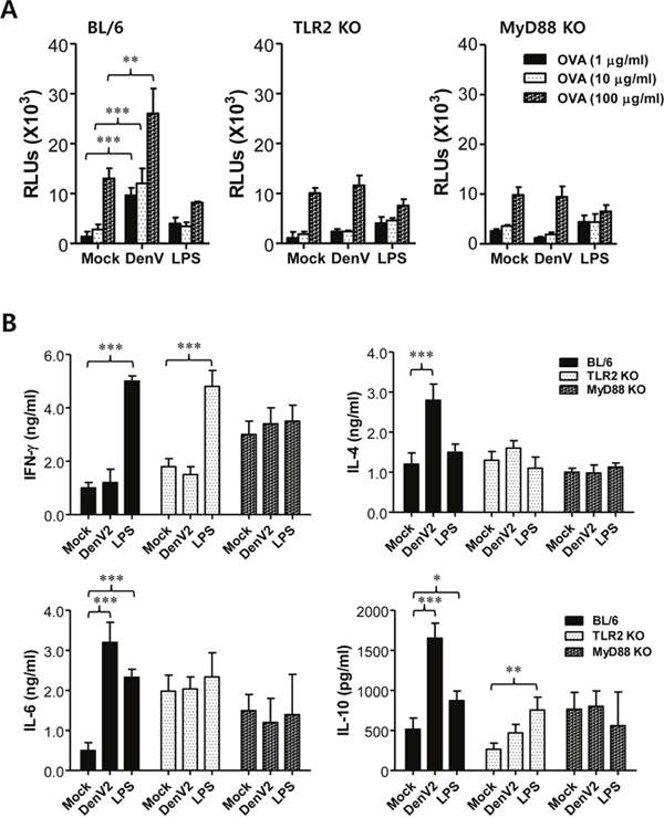 BL/6, TLR2 KO, and MyD88 KO mice (n = 6-8) were i.p. injected with 0.2 ml PBS containing 50 μg OVA in the presence or absence of DenV (1×106 ffu/mouse). At 14 days after injection, sera samples were collected to determine OVA-specific Igs. OVA-specific IgG antibodies and its isotypes were measured by ELISA as described previously [81]. Briefly, ELISA plates were coated with OVA protein (100 ng/well) and incubated at 4°C overnight. These plates were washed three times with PBST and blocked with 3% nonfat dried milk at 37°C for 2 h. Then serum samples and standard Igs were added to these plates followed by incubation at 37°C for 90 min. After these plates were washed with PBST, they were incubated with horseradish peroxidase-conjugated anti-mouse Igs for 1 h followed by color development.