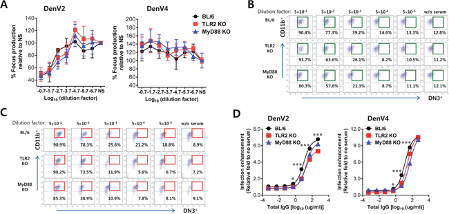 Figure 6: ADE of DenV infection is modulated by TLR2 and MyD88 molecules. (A) Neutralizing activity. DenV2 or DenV4 was incubated with serially diluted sera of DenV2-infected BL/6, TLR2 KO, and MyD88 KO mice for 1 h. Titers of infectious virus in mixtures of DenV plus serum were determined by focus-forming assay in Vero cells. (B,C) ADE assay of DenV2 and DenV4 infection. DenV2 or DenV4 (1.0 moi) was incubated with serially diluted sera of DenV2-infected BL/6, TLR2 KO, and MyD88 KO mice for 1 h and subsequently used to infect macrophages. Macrophages infected with DenV2 (B) and DenV4 (C) were evaluated by co-staining of intracellular NS1 (DN3) and surface CD11b at 24 h pi. (D) Normalized fold in ADE of DenV2 and DenV4 infection by sera of DenV2-infected BL/6, TLR2 KO, and MyD88 KO mice. Values in representative dot plots denote the average percentage of infected DN3+ macrophages from at least four independent experiments. Data in graphs denote the average ± SE of levels derived from at least four independent experiments (n = 3-4). *, p < 0.05; ***, p < 0.001 compared with levels of TLR2 KO or MyD88 KO mice.