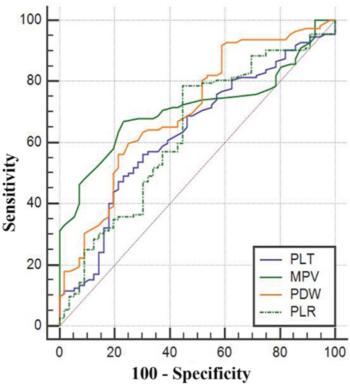 The MPV shows the average size of the platelets in the bloodstream, but it does not reflect the microscopically observed changes in the platelet size. The PDW is calculated as the coefficient of variation in the MPV, and high PDW values show that the change in the MPV is greater than normal [16]. Recently, some studies have found that an elevated pretreatment PLT or PLR was significantly and independently associated with a poor overall survival (OS) in NPC patients [17, 18].