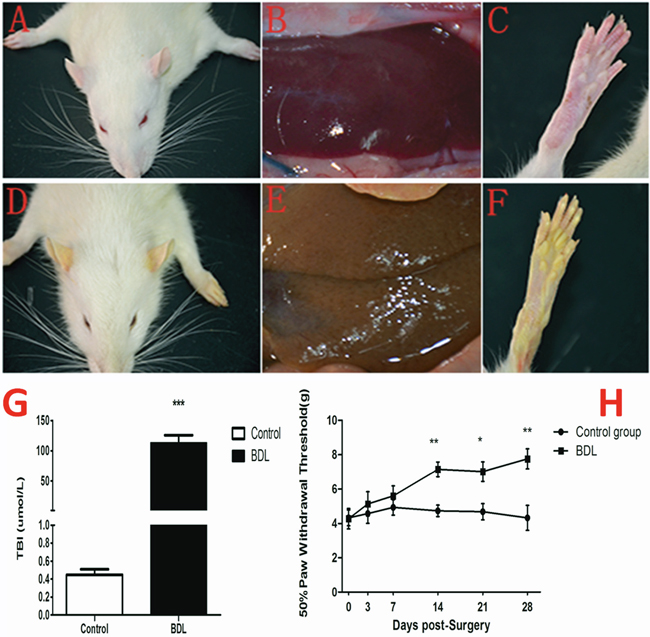 Figure 1: Evaluation of jaundice and the change of nociceptive threshold following BDL operation. (A-F) The rats in BDL group showed yellow ears (D), liver tissue(E) and rear claw(F) 28 days after surgery compared to control group (A, B, C). (G) The serum total bilirubin levels was significantly higher in the BDL group (112.8±12.88μml/L) than in the control group (0.45±0.06μml/L). (H) The mechanical PWT was tested to assess the jaundice-induced nociceptive threshold change prior to (day 0) and at days 3, 7, 14, 21, and 28 following BDL operation. The hindpaw of BDL rats displayed a dramatic decrease in mechanical PWT to von Frey filament stimulation from 4.28±0.59 g at baseline to 7.15 ±0.43 g 14d after BDL operation and further deteriorated to 7.02 ± 0.57 at day 21, and 7.76 ±0.58g at day 28. *P<0.05, **P<0.01, ***P<0.001 compared with the each corresponding time point.