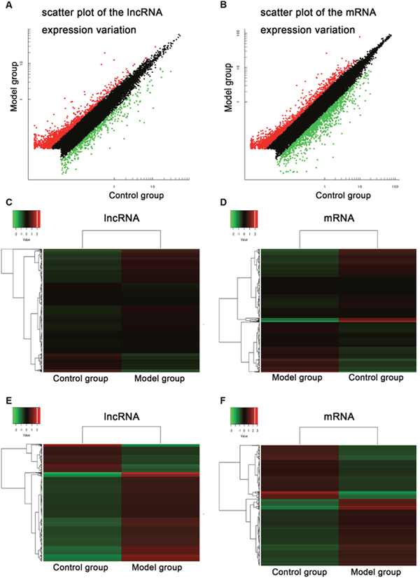 Figure 2: Common bile duct ligation resulted in the expression profiling changes of lncRNA and mRNA. Scatter plot comparing global mRNA (A) gene expression profiles in the spinal cord between BDL group (Model group) and sham group (Control group) rats; Red color is indicative of up-regulated and green color is indicative of down-regulated genes. Black color is indicative of not statistical significant different genes when it does not pass the cutoff values of 1 and −1 in log2 scale. Heat map showing hierarchical clustering of overall mRNA (B) expression pattern of reliably measured probe sets. Heat map showing hierarchical clustering of mRNA (C), whose expression changes were more than twofold. In clustering analysis, up- and down-regulated genes are colored in red and green, respectively.