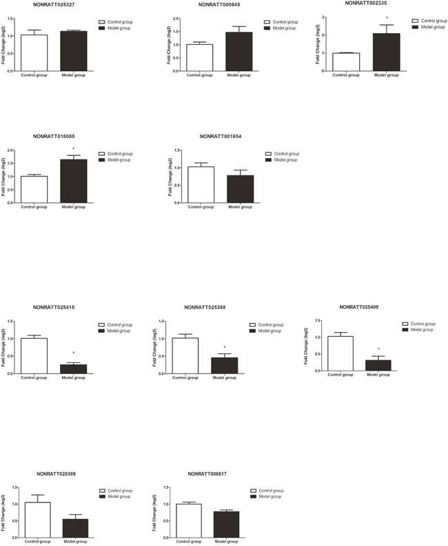 We identified that a total of 2033 lncRNAs were differentially expressed between control group and BDL group, in which 1545 probe sets were up-regulated and 488 probe sets were down-regulated, whereas a total of 2800 mRNAs were differentially expressed between control group and BDL group, in which 1548 probe sets were up-regulated and 1252 probe sets were down-regulated. The detail information of the top 20 up-regulated and 20 down-regulated lncRNAs was in Table 1, and that of the top 20 up-regulated and 20 down-regulated mRNAs was in Table 2. The maximal and minimal fold change was 35.01 and 2.01, respectively.
