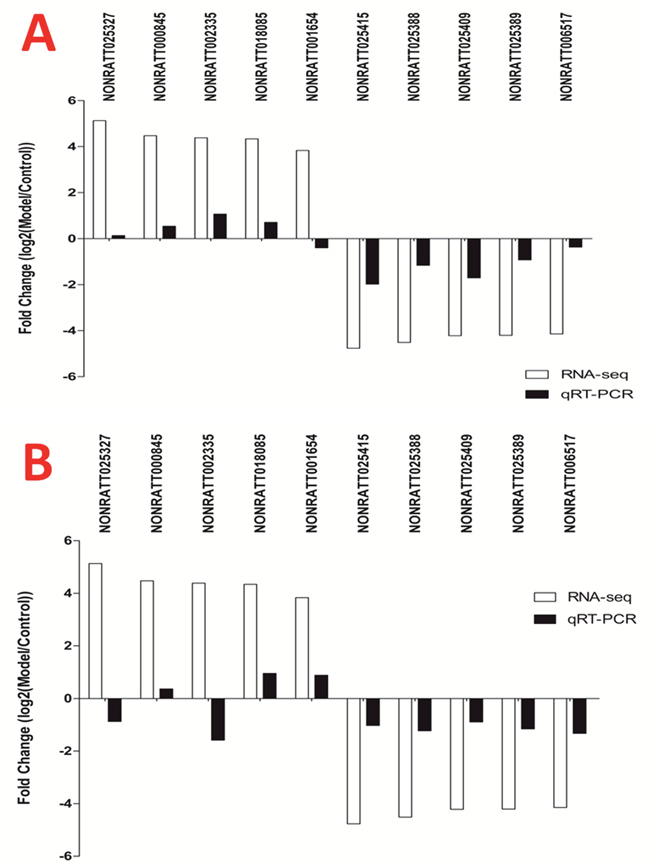To systematically identify jaundice-associated lncRNAs in spinal cord, the differential expression analysis was performed between BDL group and control group. The lncRNA and mRNA expressions of T6-T12 spinal cord of the animals were examined the HiSeq 2000 system (Illumina, Inc.) with a total of 1,198,903,526 raw reads from the nine libraries. Differentially expressed gene profiles in BDL group were compared to the corresponding data from control group. Figure 2 indicated the scatter plot comparing global mRNA (A) gene expression profiles in the spinal cord between BDL group (Model group) and sham group (Control group), and heat map showing hierarchical clustering of overall mRNA (B) expression pattern of reliably measured probe sets. In addition, heat map also showed hierarchical clustering of mRNA (C), whose expression changes were more than twofold.