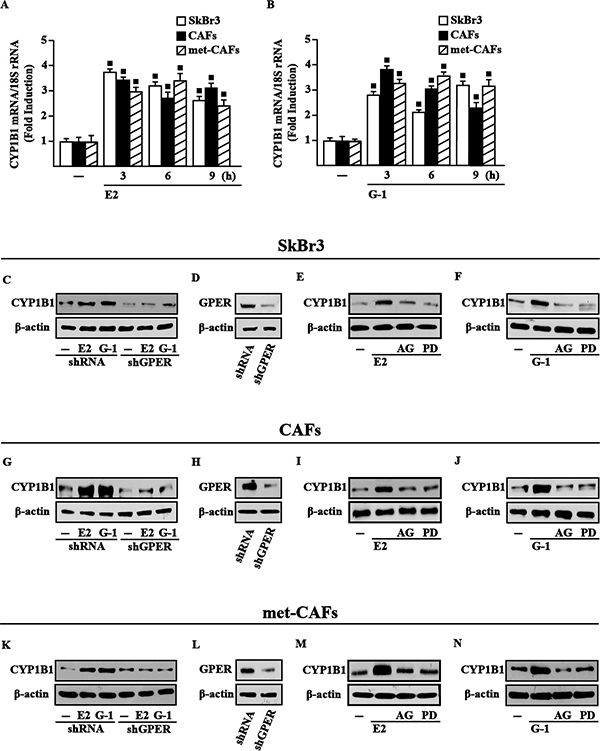 Figure 1: GPER mediates CYP1B1 induction by E2 and G-1 in SkBr3 cells, CAFs and met-CAFs. E2 (10 nM) (A) and G-1 (100 nM) (B) induce the mRNA expression of CYP1B1, as indicated. Data obtained by real-time PCR in three independent experiments performed in triplicate were normalized to 18S expression and shown as fold changes of CYP1B1 expression upon treatments with E2 and G-1 respect to cells treated with vehicle (−). (■) P < 0.05 for cells receiving treatments versus vehicle. The up-regulation of CYP1B1 protein levels induced by 10 nM E2 and 100 nM G-1 is abrogated in SkBr3 cells (C), CAFs (G) and met-CAFs (K) transfected for 24 h with shRNA or shGPER and then treated for 6 h with vehicle (−), 10 nM E2 and 100 nM G-1. (D, H, L) Efficacy of GPER silencing. Evaluation of CYP1B1 protein levels in SkBR3 cells (E–F), CAFs (I–J) and met-CAFs (M–N) upon treatment for 6 h with vehicle, 10 nM E2 and 100 nM G-1 alone or in combination with 1 μM EGFR inhibitor AG1478 (AG) or 10 μM MEK inhibitor PD98059 (PD). β-actin serves as a loading control. Results shown are representative of at least two independent experiments.
