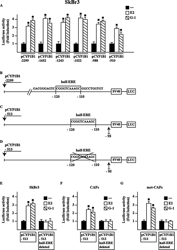 Figure 2: E2 and G-1-stimulate the transcriptional activation of CYP1B1 promoter constructs. (A) SkBr3 cells were transiently transfected for 8 h with the indicated CYP1B1 promoter constructs, then cells were treated for 18 h with vehicle (−), 10 nM E2 or 100 nM G-1. Schematic representation of the CYP1B1 5′-flanking region containing a half-ERE binding motif (B), a deletion construct containing a half-ERE binding motif (C) and a deletion construct lacking a half-ERE binding motif (D), as indicated. SkBr3 cells (E), CAFs (F) and met-CAFs (G) were transiently transfected for 8 h with the deleted CYP1B1 promoter constructs shown in panels C and D, then treated for 18 h with vehicle, 10 nM E2 and 100 nM G-1, as indicated. The luciferase activities were normalized to the internal transfection control and values of cells receiving vehicle were set as 1-fold induction upon which the activities induced by treatments were calculated. Each column represents the mean ± SD for three independent experiments, each performed in triplicate. (■) indicates P < 0.05 for cells receiving treatments versus vehicle.