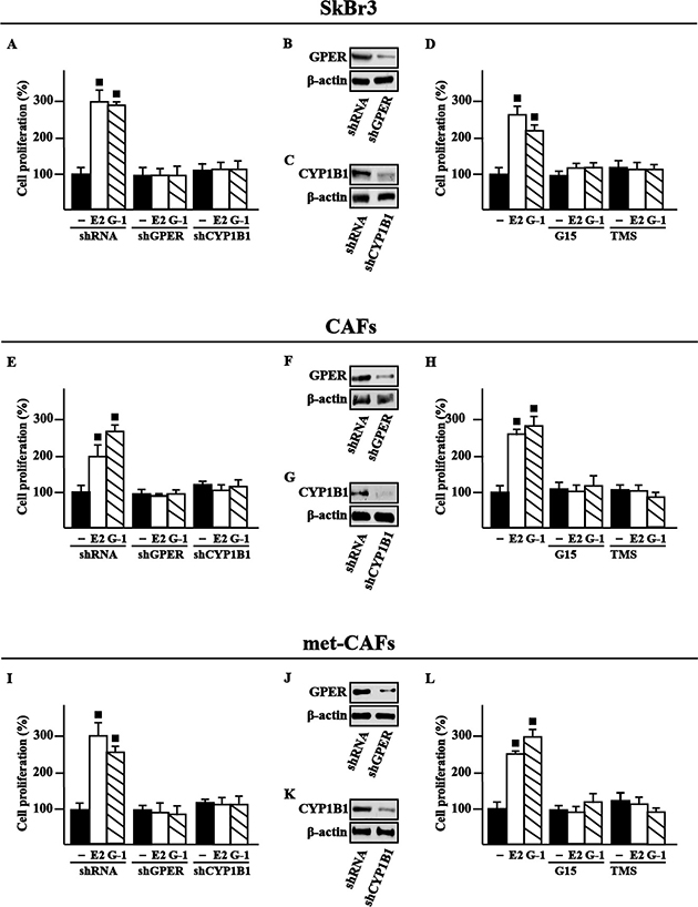 Figure 5: GPER and CYP1B1 are involved in the proliferative effects induced by E2 and G1 in SkBr3 cells, CAFs and met-CAFs. The proliferation of SkBr3 cells (A), CAFs (E) and met-CAFs (I) induced by 10 nM E2 or 100 nM G-1 is prevented silencing GPER or CYP1B1 expression. Cells were transfected every 2 days with shRNA, shGPER or shCYP1B1, treated every day with ligands and then counted on day 5. Efficacy of GPER (B, F, J) and CYP1B1 (C, G, K) silencing. β-actin serves as a loading control. The proliferation of SkBr3 cells (D), CAFs (H) and met-CAFs (L) induced by 10 nM E2 or 100 nM G-1 is prevented by 100 nM GPER antagonist G15 and 1 μM CYP1B1 inhibitor TMS. Proliferation of cells treated with vehicle (−) was set as 100% upon which cell growth induced by treatments was calculated. Each data point is the mean ± SD of three independent experiments performed in triplicate. (■) P < 0.05 for cells receiving treatments versus vehicle.