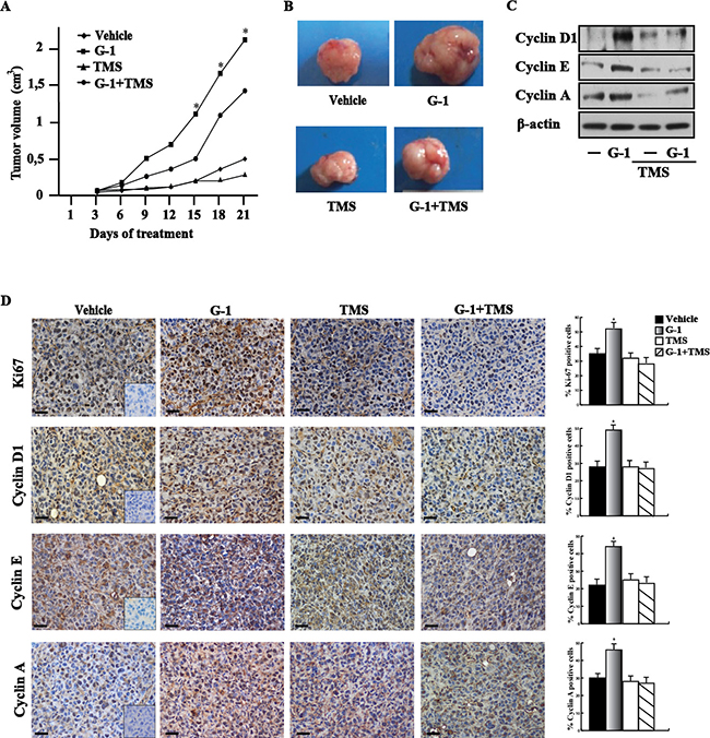 Figure 7: CYP1B1 is involved in the growth of MDA-MB-231 xenografts. (A) Tumor volume from MDA-MB-231 xenografts implanted in female athymic nude mice treated for 21 days with vehicle, G-1, TMS or both compounds, as indicated. (*) indicates P < 0.05 for animals treated with G-1 versus animals treated with vehicle. (B) Representative images of explanted tumors at day 21, scale bar, 0.3 cm. (C) Cyclin D1, cyclin E, cyclin A protein levels in tumor homogenates from MDA-MB-231 xenografts treated as reported above. β-actin serves as loading control. Results shown are representative of two independent experiments. (D) Ki67, cyclin D1, cyclin E and cyclin A immunodetection in paraffin embedded sections of explanted tumors from breast cancer xenografts treated with vehicle, G-1 and TMS alone or in combination, as indicated. Scale bar: 25 μm. Insert: negative control. Histograms represent the percentage (± SD) of immunostained positive cells treated with G-1 and TMS alone or in combination versus vehicle treated cells. (*) indicates P < 0.05.