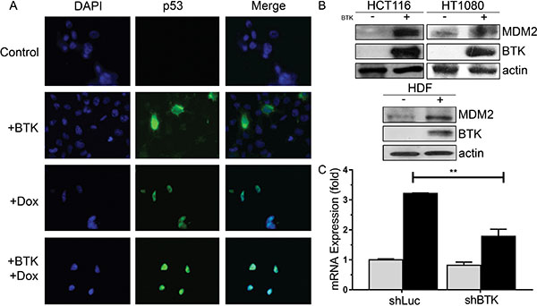 Figure 1: Effects of BTK on MDM2 expression. (A) Representative immunofluorescence images of HCT116 cells transfected with an empty vector (Control) or BTK and treated with 1.5 μM doxorubicin for 20 h, showing expression of p53. DAPI is used to stain the DNA (B) Representative Western Blots showing MDM2 and BTK protein levels in lysates of HCT116, HT1080 and HDF transfected with BTK or an empty vector (Control) and all treated with 1.0 μM doxorubicin for 24 hours. β-actin levels are provided as loading controls, as in all other blots. (C) Real time PCR data showing relative expression of MDM mRNA in HCT116 stably transfected with a shRNA against luciferase (shLuc, as a control) or BTK, and treated with 1.5 μM doxorubicin for 24h. Bars represent mean values of three experiments and error bars show standard deviation. **p < 0.01.