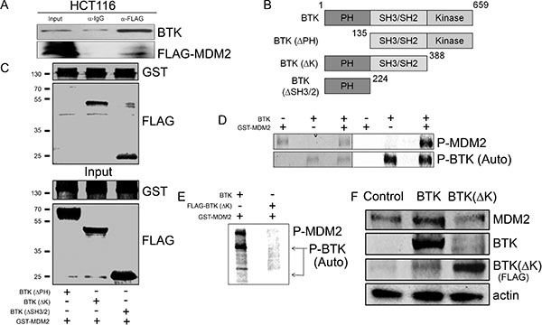 Figure 2: BTK binds to and phosphorylates MDM2. (A) Immunoprecipitation (IP) with lysates of HCT116 transfected with BTK and FLAG-tagged MDM2. IP was performed with a FLAG or IgG antibody and the Western blots used BTK and FLAG antibodies. (B) Schematic representation of the BTK constructs used in C. (C) Binding assay in HCT116 cells transfected with different BTK constructs and GST-tagged MDM2. The top blot shows binding to glutathione beads; the bottom blot shows input levels. Numbers on the left indicate approximate protein weight (kDa). (D) In vitro phosphorylation assay showing phosphorylation of MDM2 by BTK as well as BTK autophosphorylation. (E) Same as (D) using a wild type BTK construct or a FLAG-tagged BTK lacking the kinase domain (BTK(ΔK)). (F) Western blots showing MDM2 and BTK protein levels in lysates of HT1080 transfected with an empty vector (Control), BTK or FLAG-BTK(ΔK), with all samples treated with 1.5 μM doxorubicin for 24 h.