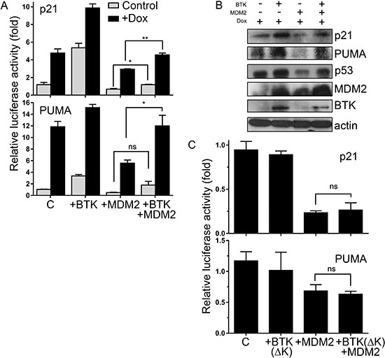 Figure 3: BTK prevents MDM2 inhibition of p53 transactivation functions. (A) Relative luciferase activity of p21 and PUMA reporters in HCT116 cells in which BTK and/or MDM2 has been transfected 24 h before, in the absence or presence of 1.5 μM doxorubicin for 24 h. Control cells (C) were transfected with an empty vector. Graphs represent mean of a triplicate experiment, error bars represent standard deviation. ns: non significant; *P ≤ 0.05; **P ≤ 0.01. (B) Western blot showing protein levels of p21, PUMA, p53, MDM2 and BTK in the same cells. (C) Relative luciferase activity of p21 and PUMA reporters in HCT116 cells in which BTK(ΔK) and/or MDM2 have been transfected 24 h before, all in the presence of 1.5 μM doxorubicin for 24 h. Control cells (C) were transfected with an empty vector.