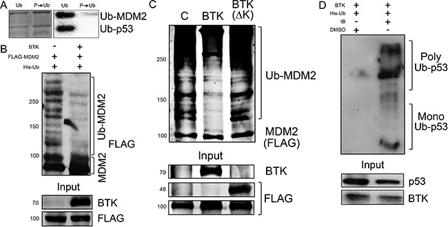 Figure 4: BTK inhibits MDM2 ubiquitination activity. (A) In vitro ubiquitination assay of p53 and GST-tagged MDM2, before or after using BTK to phosphorylate MDM2. Left panel shows total amounts of protein loaded in the gel and right panel shows a Western blot of ubiquitinated proteins. (B) In vivo ubiquitination assay using HT1080 cells transfected with BTK and FLAG-tagged MDM2. (C) In vivo ubiquitination assay using HT1080 cells transfected with an empty vector (C), BTK or FLAG-BTK(ΔK). All samples were also transfected with FLAG-MDM2 and His-Ubiquitin. Numbers on the left indicate approximate protein weight (kDa). (D) Same as B, in HCT116 cells treated or not with 0.5 μM ibrutininb (IB) for 24 h, showing poly- and mono-ubiquitinated p53.
