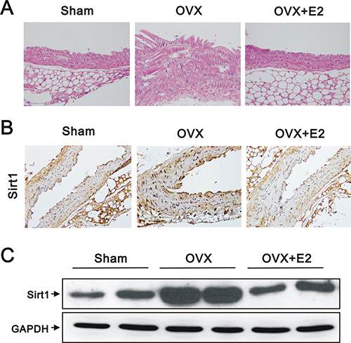 Figure 1: Histology, IHC, and western blot analyses of aortas from sham, OVX, and OVX+E2 mice. (A) Representative images of hematoxylin and eosin stained, paraffin-embedded aortas (original magnification, 400×), (B) representative IHC staining for SIRT1 expression (original magnification, 400×), and (C) western blots using anti-SIRT1 and anti-GAPDH antibodies of aortic tissues from sham, OVX, and OVX+E2 mice.
