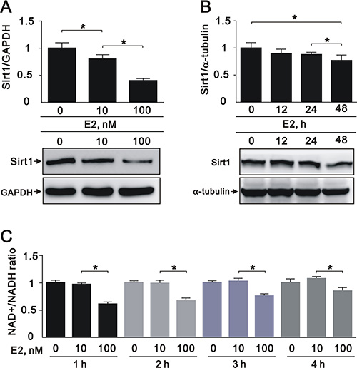 Figure 2: E2 treatment downregulated SIRT1 expression in the A7r5 rat smooth muscle cell line We treated A7r5 cells with 10 nM and 100 nM E2. (A), or over a time course with 10 nM E2 (0, 12, 24, and 48 h) (B); we subjected the samples to western blot analysis to quantify SIRT1, GAPDH, and α-tubulin protein expression. (C) We analyzed the NAD+/NADH ratio in A7r5 cells subjected to the indicated treatments. Data are expressed as mean ± standard deviation (SD). Representative data shown are from experiments performed independently at least 3 times. *p < 0.05