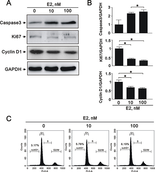 Figure 3: E2 treatment regulated A7r5 apoptosis, proliferation, and migration. (A) Representative immunoblots of protein samples from A7r5 cells treated with 10 nM and 100 nM E2 that were stained with antibodies against caspase 3, Ki-67, cyclin D1, and GAPDH. (B) We quantified caspase 3, Ki-67, and cyclin D1 protein expression by computer-assisted densitometry analysis and presented their ratios to GAPDH, relative to the control group. (C) We performed flow cytometry on A7r5 cells treated with 10 nM and 100 nM E2, in order to assess the percentage in the G1 phase of the cell cycle.