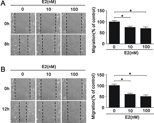 Figure 4: Migration of A7r5 cell treated with E2. Wound healing assays were performed on A7r5 cells treated with 10 nM and 100 nM E2 for (A) 8 h and (B) 12 h. Black arrows indicate the wound edge. The residual gap between the migrating cells from the opposing wound edge is expressed as a percentage of the initial scraped area. Data are expressed as mean ± SD. Representative data shown are from experiments performed independently at least 3 times. *p < 0.05