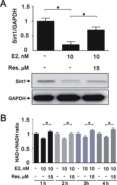 Figure 5: Resveratrol reversed the effects of E2 on SIRT1 expression in A7r5 cells. (A) We treated A7r5 cells with 10 nM E2 with and without resveratrol (Res, 15 μM); we then performed western blot analyses to quantify the levels of SIRT1 and GAPDH. (B) We analyzed the NAD+/NADH ratio in the presence and absence of resveratrol. Data are expressed as mean ± SD. Representative data shown are from experiments performed independently at least 3 times. *p < 0.05