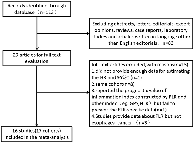 Inclusion criteria for the primary analysis was as follows: (1) patients with esophageal cancers in the studies were histopathologically confirmed; (2) the PLR was measured before treatment; (3) investigated the association of PLR with overall survival (OS), disease-free survival (DFS) or cancer-specific survival (CSS); (4) full text articles in English. Exclusion criteria was as follows: (1) abstracts, letters, editorials, case reports, reviews or nonhuman research; (2) the full text was not available in English; (3) studies with insufficient data for estimating HR and 95% CI; (4) studies had overlapping or duplicate data.