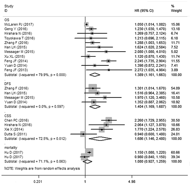 ADC: adenocarcinoma, CI: confidence interval, CSS cancer-specific survival, DFS disease-free survival, HR hazard ratio, Mixed treatment including adjuvant/neoadjuvant±chemotherapy/chemoradiotherapy/radiotherapy±surgery, N number of studies, OS overall survival, SCC squamous cell carcinoma, Ph p value of Q test for heterogeneity test.