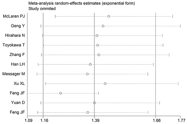 Sensitivity analysis was performed by eliminating one study at a time and analyzing the remaining studies. The results are shown in Figure 3, the results were not substantially changed, showing the reliability and stability of our results. Furthermore, a meta-regression was also conducted to explore the potential factors that are responsible for heterogeneity in OS, The results showed that the above factors could partly explain the heterogeneity but did not reach statistical significance (Table 2).