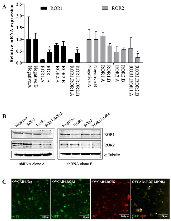 Figure 1: ROR1 and ROR2 knockdown in ovarian cancer cells. (A) ROR1 expression is represented as black bars, ROR2 expression is represented as grey bars. Two separate clones (labelled A and B) are shown for each ROR shRNA. OVCAR4 shRNA clones A and B are paired for each condition (negative control, ROR1 siRNA, ROR2 siRNA and ROR1. ROR2 siRNA). Significant p-values represent comparison to corresponding clone negative control. ROR1 expression (Black bars) is decreased at the mRNA level following shRNA induced knockdown in OVCAR4, in clones A and B. No effect is seen on ROR1 levels in ROR2.shRNA cells. ROR2 (grey bars) is decreased at the mRNA level following shRNA induced knockdown in OVCAR4, in clones A and B. Significant p-values represent comparison to corresponding negative control. No effect is seen on ROR2 levels in ROR1.shRNA cells. qRT-PCR was performed in triplicate and normalised to three different housekeeping genes (SDHA, HSPCB, RPL13A). Results represent an average of four experiments. Error bars represent the s.d of the mean. (B) Representative Western blots reflect protein expression of ROR1 and ROR2 knockdown in shRNA treated OVCAR4. Left panel: clone A, right panel: clone B. In each panel, top row ROR1, middle row ROR2, bottom row α-tubulin (loading control). (C) Representative fluorescence images of Negative shRNA (GFP expressing), ROR1 shRNA (GFP expressing), ROR2 shRNA (RFP expressing) and double knockdown ROR1 and ROR2 shRNA (GFP and RFP expressing) OVCAR4 cells.