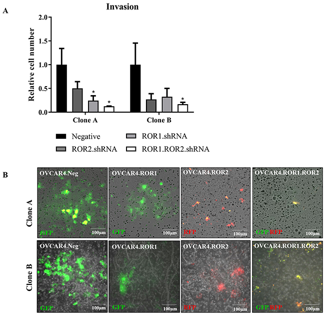 Figure 3: ROR1 and ROR2 silencing decreases OVCAR4 invasion into omentum model. (A) Graph represents average number of cells invaded through membrane for both clone A and clone B after 48 hours. ROR1 and ROR2 shRNA cells had decreased invasive capacity however double ROR1 and ROR2 shRNA was most significant (P<0.05, n=3). Results represent an average of three experiments. Error bars represent the s.d of the mean (B) Representative images of fluorescently tagged OVCAR4 cells invaded through membrane. Top panel: clone A, bottom panel: clone B.