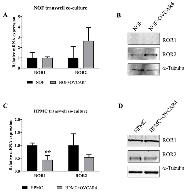 Figure 4: Indirect co culture of HPMC and NOFs with OVCAR4 affect stromal ROR expression. (A) mRNA expression of ROR1 and ROR2 in NOF (Black bar) and NOF cultured with OVCAR4 (Grey bar). A significant increase in ROR2 mRNA was found when NOF was cultured with OVCAR4 (p=0.05, n=3) and no change in ROR1 mRNA observed. qRT-PCR was performed in triplicate and normalised to three different housekeeping genes (SDHA, HSPCB, RPL13A). Results represent an average of three experiments. Error bars represent the s.d of the mean. (B) Representative Western blot analysis of protein expression of ROR1 (top panel), ROR2 (middle panel) and loading control α-tubulin (bottom panel) shows an increase in ROR2 in NOF cultured with OVCAR4 cells reflecting mRNA expression, whilst no expression of ROR1 protein is detected. (C) mRNA expression of ROR1 and ROR2 in HPMC (Black bar) and HPMC cultured with OVCAR4 (Grey bar). A significant decrease in ROR1 mRNA was found when HPMC was cultured with OVCAR4 (p<0.01, n=3). qRT-PCR was performed in triplicate and normalised to three different housekeeping genes (SDHA, HSPCB, RPL13A). Results represent an average of three experiments. Error bars represent the s.d of the mean. (D) Representative Western blot analysis of protein expression of ROR1 (top panel), ROR2 (middle panel) and loading control α-tubulin (bottom panel) in HPMC cultured with OVCAR4.