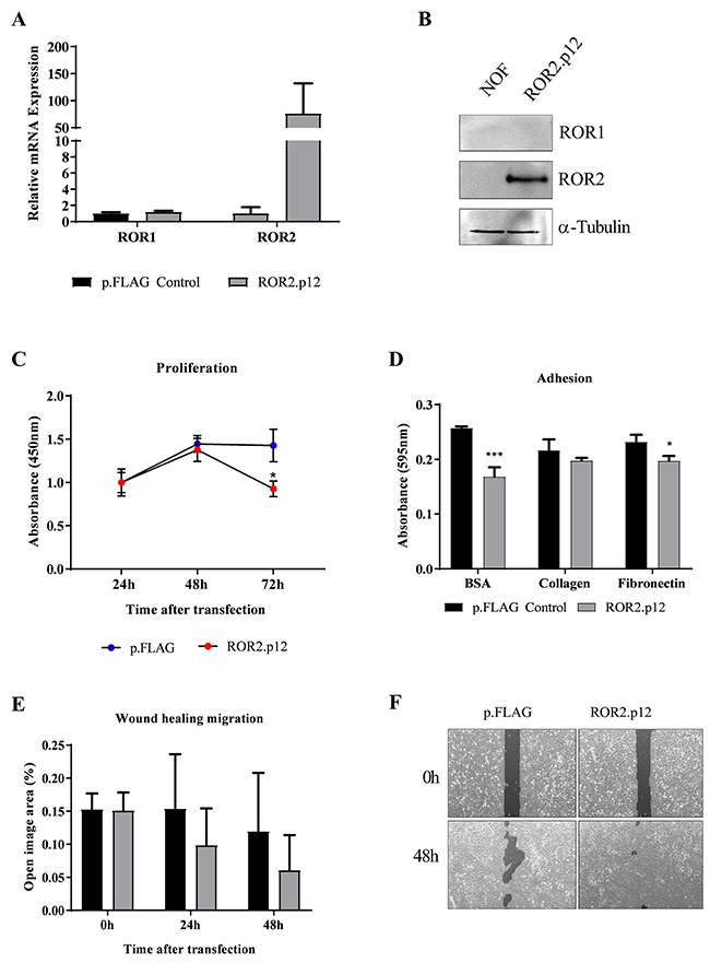 Figure 5: ROR2 overexpression in NOFs increases migration. (A) Ectopic overexpression of ROR2 in NOFs increases mRNA levels over 100-fold, with no change to ROR1. qRT-PCR was performed in triplicate and normalised to three different housekeeping genes (SDHA, HSPCB, RPL13A). Error bars represent the s.d of the mean, repeated three times. (B) Representative Western blot analysis of protein expression of ROR2 (top panel), ROR1 (middle panel) and loading control α-tubulin (bottom panel) shows successful transfection of ROR2 plasmid in NOFs. (C) Significant loss of proliferation in NOFs is seen after 48 hours of initial ROR2 overexpression (Red circles, P<0.05, n=3). (D) 2D adhesion to BSA control, Collagen and fibronectin after ROR2 ectopic expression in NOFs (grey bars). Significant decrease in adhesion after ROR2 overexpression is observed (P<0.05, n=3). (E) NOF wound healing capacity is increased, as indicated by a decrease in ‘open image area’, after ectopic ROR2 overexpression (grey bar). (F) Representative images of ‘open image area’ (dark grey shading) measured in wound healing assay.