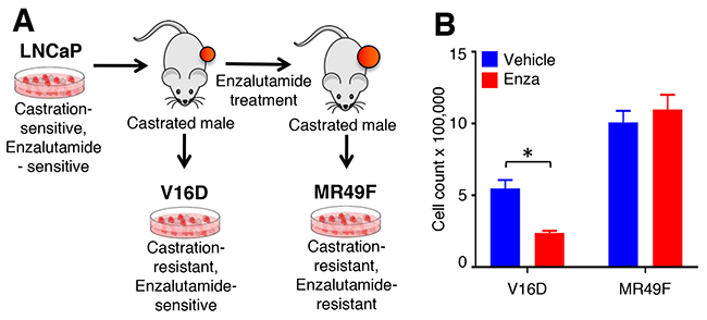 Figure 1: Cell line models of enzalutamide resistance. (A). Castration-sensitive, enzalutamide-sensitive human LNCaP cell line underwent serial murine xenograft transplantation in the setting of androgen deprivation therapy to produce a castration-resistant but enzalutamide-sensitive V16D cell line model. Continued xenograft transplantation in the presence of enzalutamide gave rise to the castration-resistant and enzalutamide-resistant MR49F cell model. (B). V16D and MR49F cell counts after 5 days of 10 μM enzalutamide treatment confirm that the MR49F cell line is resistant to enzalutamide while the V16D cell line remains sensitive. Bars represent the mean of the Invitrogen Countess automated cell count. *** denotes statistical significance (p < 0.05).