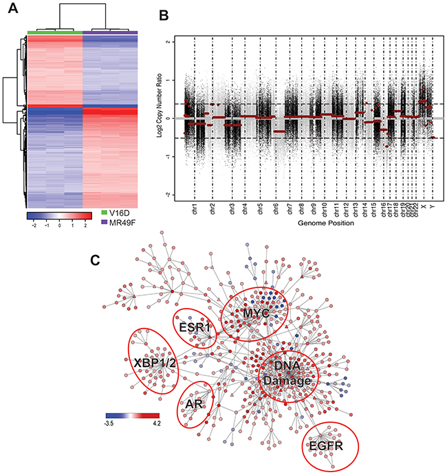 Figure 2: Molecular profiling of MR49F. (A). Heatmap showing the 586 differentially expressed genes with a fold-change > 2 between MR49F and V16D (FDR-adjusted q < 0.05). Color reflects median centered expression values. (B). Copy number aberrations in cell line MR49F relative to V16D. Each dot represents the log2 ratio between MR49F and V16D cell lines for one probe region of the captured exome. Horizontal red lines represent the normalized log2 ratio after segmentation. (C). Differentially regulated PARADIGM network rendered with Cytoscape. Node color represents PARADIGM-inferred IPL scores where red indicates up-regulated in and blue indicates down-regulated in MR49F as compared to V16D. Triangle-shaped nodes indicate druggable targets. Biologically meaningful deregulated subnetworks are indicated.