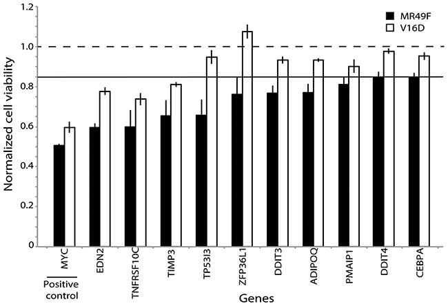 Figure 3: Functional validation of PARADIGM-nominated gene candidates identifies genes mediating enzalutamide resistance. Bars represent viability in V16D or MR49F cell lines after RNAi knock-down with specific genes, where viability scores have been normalized against scramble control. Horizontal line at 0.85 represents the minimum viability effect required to indicate a functional hit. Error bars represent s.e.m.