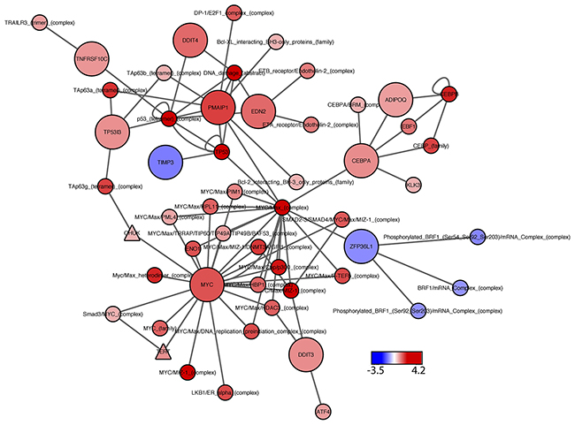 Figure 4: PARADIGM subnetwork for top-hit genes. Network includes the statistically significant siRNA hits, positive control (MYC), and their first neighbors, as identified from the PARADIGM curated pathway information file. Node color represents PARADIGM network scores, where blue indicates down-regulated activity in MR49F as compared to V16D, and red indicates upregulated network activity. Node shape: circles represent PARADIGM network entities, with significant siRNA hits indicated by large circles; triangles indicate drug targets.