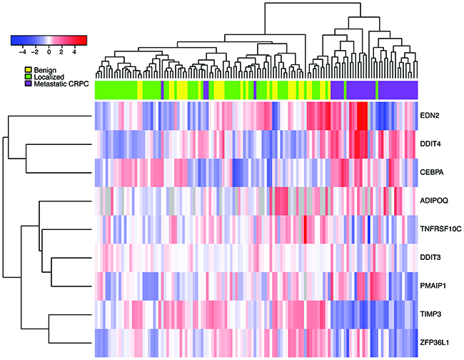 We next sought to determine the clinical significance of hits identified from our pre-clinical studies. Publically available datasets of enzalutamide-sensitive and resistant cells were not available, so instead, we assessed the expression of our 10 “top hit” genes in a cohort of human samples comprised of metastatic CRPC and localized prostate cancer samples [12]. Importantly, several of the top-hit genes were more highly expressed in the metastatic CRPC samples as compared to the localized prostate cancers (Figure 5). These genes include: ADIPOQ, CEBPA, and DDIT4. We also observed concordant down-regulation of expression of TIMP3 and ZFP36L1 in both the enzalutamide-resistant MR49F cell line and metastatic CRPC prostate cancers. Taken together, these findings demonstrate the relevance of our in vitro studies and suggest that these pathway nodes may already be selected for in the transition from hormone-responsive prostate cancer to CRPC tumors.