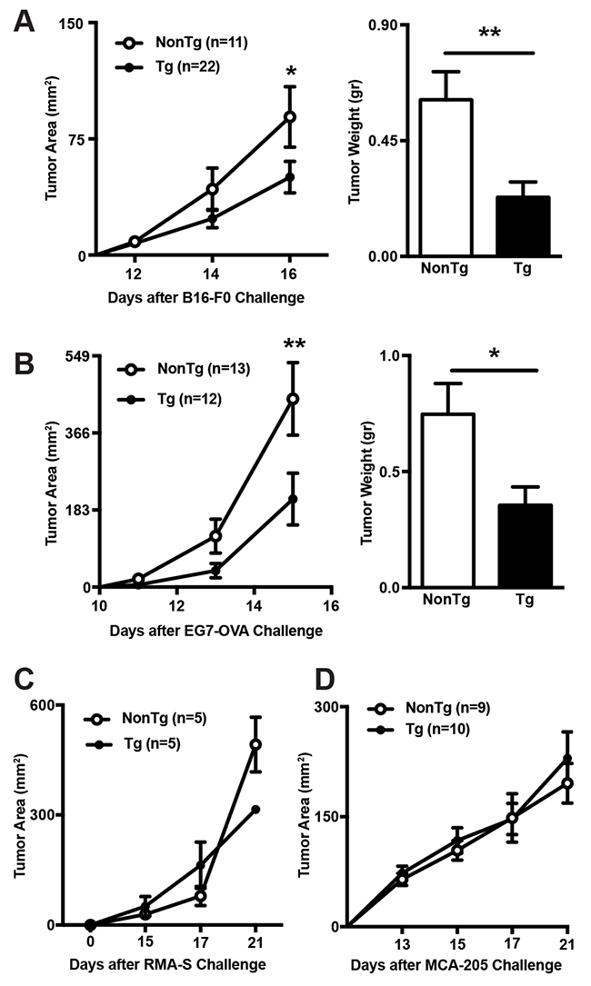 Figure 1: Comparison of tumor growth rates between shCD5EμTg and NonTg mice. (A) shCD5EμTg (n = 22) and NonTg mice (n = 11) were injected s.c. with 5×104 B16-F0 melanoma cells and tumor area measured every other day (left panel). Tumor weight at day 16 is also represented (right panel). (B) Same as in A but injecting s.c. shCD5EμTg (n = 12) and NonTg (n = 13) mice with 5×104 EG7-OVA cells. (C) Tumor area curve from shCD5EμTg mice (n = 5) and NonTg (n = 5) injected s.c. with 5×104 RMA-S cells. (D) Tumor area curve from shCD5EμTg (n = 10) and NonTg (n = 9) mice injected s.c. with 5×104 MCA-205 cells. Values are represented as mean ± SEM. *p< 0.05; **p< 0.01 (unpaired t test).