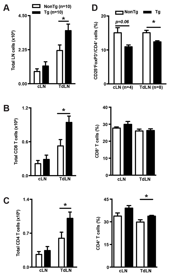 Figure 2: shCD5EμTg mice display increased lymphoid cell numbers in TdLN. (A) Total cell numbers from cLN and TdLN of shCD5EμTg (n = 10) and NonTg (n = 10) mice challenged with 5×104 B16-F0 cells were counted from single cell suspensions. (B-C) Total numbers and percentage of CD8+ (B) and CD4+ (C) T cells from cLN and TdLN from the same mice as in A. (D) Percentage of CD25+FoxP3+ cells in CD4+ from cLN and TdLN of shCD5EμTg (n = 8) and NonTg (n = 8) mice challenged with B16-F0 cells. Values are represented as mean ± SEM in a conventional mice facility. *p< 0.05 (unpaired t test).