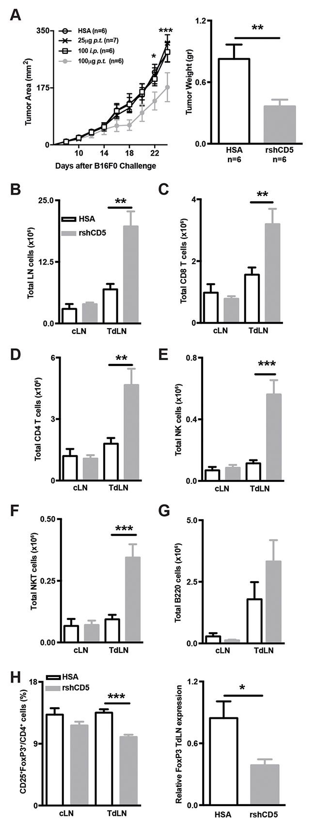 Figure 4: Exogenous administration of rshCD5 to WT mice mimics the anti-tumor effects of shCD5EμTg mice. (A) Tumor growth curve in HSA- and rshCD5-treated WT C57BL/6J mice (n = 6-7/group) injected s.c. with 5×104 B16-F0 cells (left panel). HSA (100 μg p.t.) or rshCD5 (25 or 100 μg, p.t. or i.p.) were administered every 48 h starting when tumor size was approx. 9-12 mm2 (~day 7 post-injection). Tumor weight at day 23 is also represented (right panel). (B) Total cell numbers in cLN and TdLN from the same mice as in (A). (C-G) Total number of CD8+ (C), CD4+ (D) cells, NK (E), NKT (F) and B220+ (G) cells in cLN and TdLN from the same mice as in (A). (H) Percentage of CD25+FoxP3+ cells in CD4+ from cLN and TdLN from the same mice as in A (left panel). The relative FoxP3 mRNA expression in TdLN cells from the same mice is represented (right). Data are presented as mean ± SEM. *p< 0.05, **p< 0.01, and ***p<0.0001 (unpaired t test).