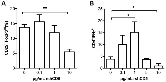 Figure 5: Effect of rshCD5 on in vitro Treg and TH1 polarization. Sorted naïve T cells CD4+CD25-CD62LhiCD44lo cells (1 × 105) from C57BL/6 mice were activated for 96 h in triplicate with plate-bound α-CD3 (2 μg/mL) and soluble α-CD28 mAb (0.5 μg/mL) under (A) Treg polarization (α-IL-4 mAb, 1 μg/mL; TGF-β, 2 ng/mL; IL-2, 5 ng/mL; and of α-IFN-γ, 1 μg/mL) or (B) TH1 polarization (α-IL-4 mAb, 10 μg/mL; IL-2, 5 ng/mL; and IL-12, 10 ng/mL) conditions in the presence of different amounts of rshCD5 (0-10 μg/mL). Then cells were (A) stained for surface CD4, CD25 and intracellular FoxP3 expression or (B) re-stimulated for 5 h with PMA (80 nM) and Ionomycin (1 μg/mL) in the presence of 2 μM Monensin followed by surface CD4 and intracellular IFN-γ staining, for further flow cytometry analyses. Data represent the mean percentage of double-positive cells (mean ± SD) from three experiments (A) or one representative experiment of two (B) performed. *, p<0.05; **, p<0.01 (Unpaired t-test).
