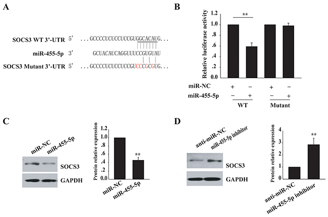 Figure 2: SOCS3 is a target of miR-455-5p. (A) SOCS3is predicted to be a target of miR-455-5p. The sequences of the putative miR-455-5p binding sites in wild type and mutant (red) SOCS3-3’UTR. (B) SOCS3 3’-UTR luciferase reporter assays in 293T cells. (C) Western blot analysis of SOCS3 protein levels in miR-455-5p mimics transfected H460 cells. (D) Western blot analysis of SOCS3 protein levels in anti- miR-455-5p-transfected H1299 cells. Error bars represent SD. **, P < 0.01. Results shown are representative of three independent experiments.