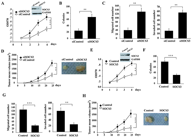 Figure 3: miR-455-5p promotes NSCLC tumorigenesis via targeting SOCS3. (A-D) RNAi knockdown of SOCS3 in H460 cells promoted the cell proliferation (A), soft-agar colony formation assays (B), Transwell cell migration and invasion (C), and xenograft tumor growth in nude mice (D) (E-H), ectopic expression of SOCS3 in H1299 cells decreased the cell proliferation (E), soft-agar colony formation assays (F), Transwell cell migration and invasion (G), and xenograft tumor growth in nude mice (H). Error bars represent SD. **, P < 0.01; ***, P < 0.001. Results shown are representative of three independent experiments.