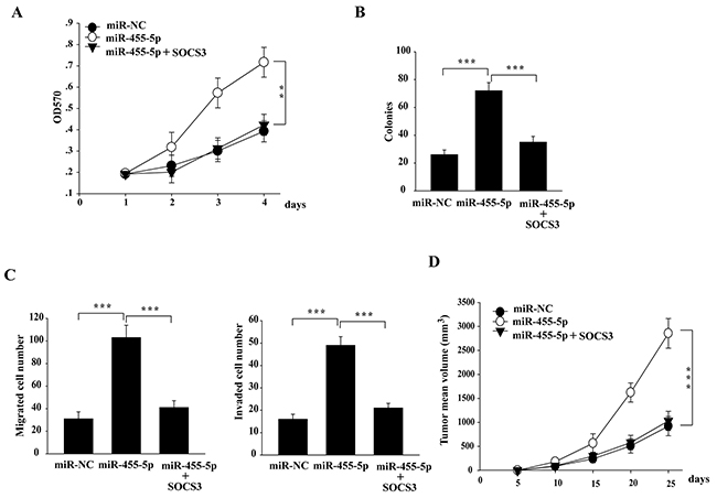 Figure 4: The miR-455-5p-SOCS3 axis is of functional importance in regulating tumorigenesis in NSCLC cells. (A-D) ectopic expression of SOCS3 in miR-455-5p mimics-transfected H460 cells significantly attenuated the effect of miR-455-5p on the cell proliferation (A), soft-agar colony formation assays (B), Transwell cell migration and invasion (C), and xenograft tumor growth in nude mice (D). Error bars represent SD. **, P < 0.01; ***, P < 0.001. Results shown are representative of three independent experiments.