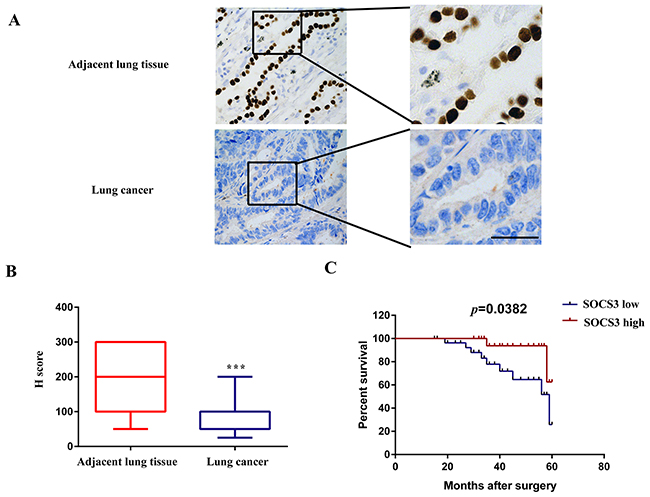 Figure 5: SOCS3 is significantly down-regulated in NSCLC tissues and is correlated with poor clinical outcomes. (A) Representative immunostaining of SOCS3 expression in human NSCLC tissues and corresponding adjacent lung tissues. Bar=200μm. (B) Quantitative analysis of SOCS3 expression in 57 cases of paired NSCLC tissues and their corresponding adjacent lung tissues. The P-value corresponds to the comparison of SOCS3 expression between the NSCLC tissues and corresponding adjacent lung tissues. ***, P < 0.001. (C) Kaplan-Meier analysis of overall survival in all NSCLC patients according to SOCS3 protein level.