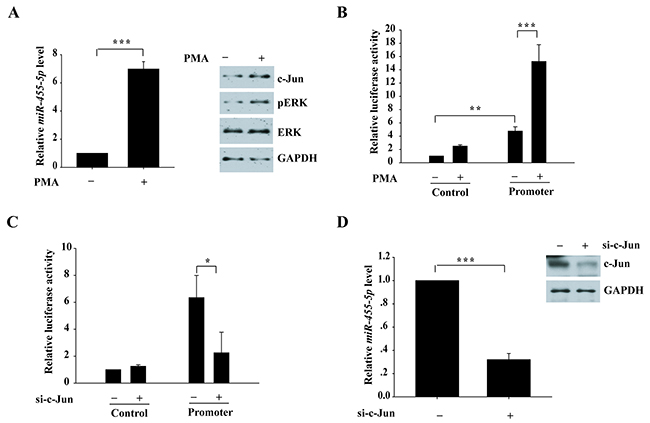 Next, we tested whether ERK signaling regulates miR-455-5 expression. Phorbol 12-myristate 13-acetate (PMA) in H460 cells was used to activate ERK1/2. The expression of miR-455-5p was significantly up-regulated (7 fold) with PMA stimulated compared to the control (Figure 7A). PMA treatment increased pERK and c-Jun expressions at protein level (Figure 7A). Additionally, a luciferase reporter including miR-455-5p promoter region significantly up-regulated luciferase activity (5 fold) compared to the control vector, and the effect was much stronger with PMA treatment (3 fold; Figure 7B), suggesting the ERK signaling pathway might regulate miR-455-5p. To explore whether c-Jun plays a role in the transcription of miR-455-5p, we found that knockdown of c-Jun notably inhibited miR-455-5p promoter vector-induced luciferase activity (3 folds; Figure 7C). Furthermore, knockdown of c-Jun decreased miR-455-5p expression in H460 cells (3.3 fold; Figure 7D). These results suggest that ERK signaling pathway promotes miR-455-5p expression.