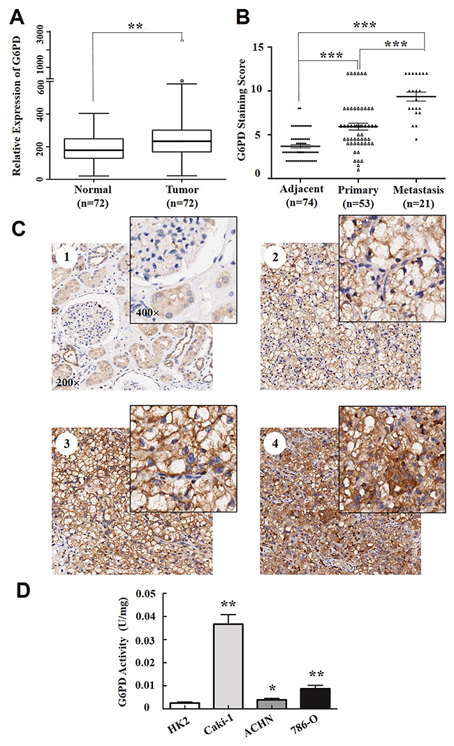 Figure 1: G6PD is overexpressed in RCC. (A) Expression profiling of G6PD from Gene Expression Omnibus (GEO) datasets in ccRCC samples and normal renal tissues (n=72). ** p < 0.01 vs. Normal (Wilcoxon rank-sum test). (B) Staining scores of G6PD in adjacent normal tissues (n=74), primary RCC without lymph node or distant metastasis (n=53) and metastasis RCC (n=21). *** p < 0.001 vs. Adjacent or Primary (Kruskal-Wallis one-way analysis). (C) Representative images of immunohistochemical staining and cellular distributions for G6PD in noncancerous renal tissues (C1, weak G6PD expression), early TNM stage (C2, moderate G6PD expression), Stage III and Stage IV (C3-C4, strong G6PD expression) RCC samples. Images were captured using 20× and 40× objective lens. (D) G6PD activity assays in HK2 (human renal tubular epithelial cell line) and 3 RCC cell lines (Caki-1, ACHN and 786-O). * p < 0.05, ** p < 0.01 vs. HK2 (one-way ANOVA). Values are means ± SD of three independent experiments, each performed in triplicate.