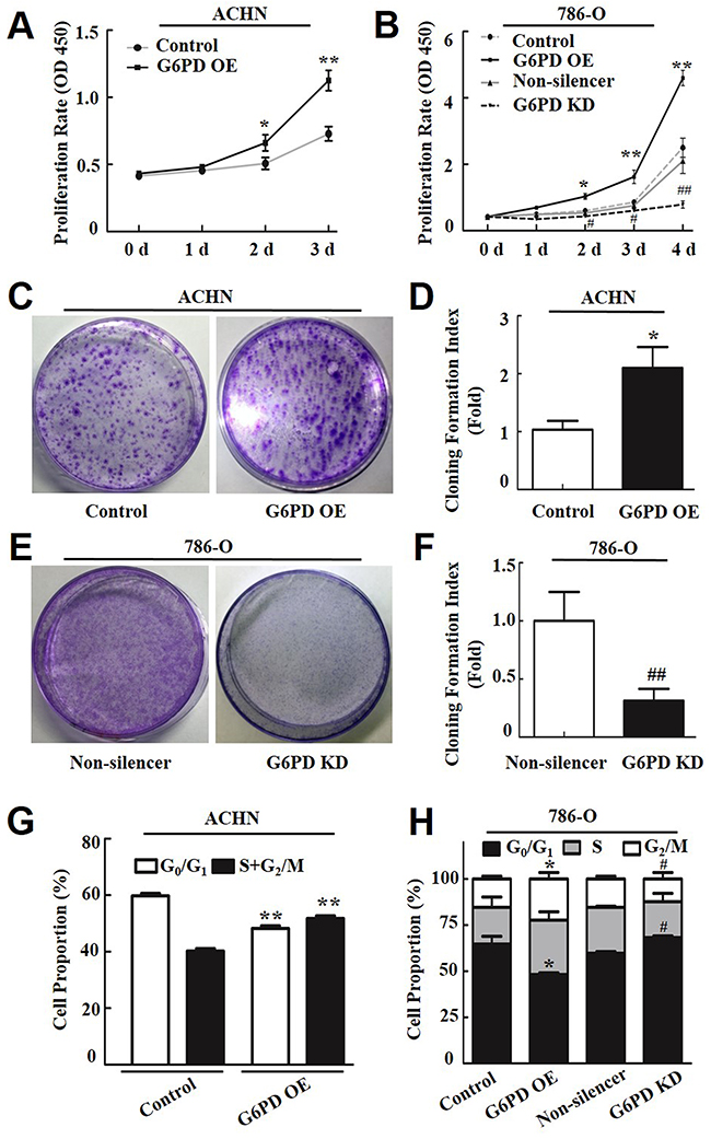 Figure 2: G6PD enhances RCC cell proliferation and affects cell-cycle phase distribution. (A-B) The cell proliferation rate of transfected ACHN (A) and 786-O cells (B) was determined using the CCK-8 assay at indicated days post-seeding. The data represent three independent experiments, each performed in triplicate. (C-F) The plate clone formation assay and quantification assessment were performed to determine the proliferation rate of ACHN (C-D) and 786-O (E-F) cells transfected with the G6PD OE plasmid, G6PD KD plasmid, or the control vectors. (G-H) Flow cytometry analysis of ACHN (G) and 786-O (H) cell cycle distributions. The data are means ± SD from three independent experiments, each performed in triplicate. * p < 0.05, ** p < 0.01 vs. Control; # p < 0.05, ## p < 0.01 vs. Non-silencer (unpaired Student t-test). Control, G6PD OE, Non-silencer and G6PD KD represent cells transfected with pBABE-puro, pBABE-puro-G6PD, pSR-GFP/Neo-Non-silencer and pSR-GFP/Neo-G6PD shRNA plasmids, respectively.