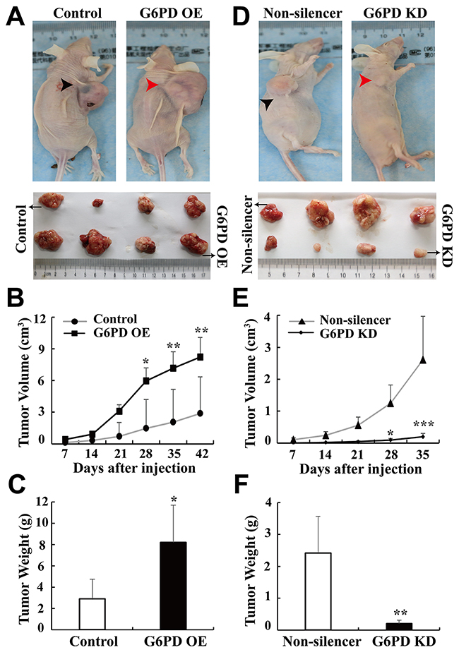 Figure 3: G6PD promotes xenografted RCC development in vivo. (A-C) 786-O cells stably transfected with pBABE-puro (Control) or pBABE-puro-G6PD (G6PD OE), (D-E) 786-O cells stably transfected with pSR-GFP/Neo-Non-silencer (Non-silencer) or pSR-GFP/Neo-G6PD shRNA (G6PD KD). 1 × 107 appropriate cells were resuspended in 200 μl PBS and injected subcutaneously into the right oxter flank of each BALB/c nude mice. Representative images of tumor-bearing mice (top panel) and the tumors isolated from each group (bottom panel) at day 42 (Control or G6PD OE) or day 35 (Non-silencer or G6PD KD) are shown in A and D. Tumor size was monitored at indicated days post-injection and the results are shown in B and E. * p < 0.05, ** p < 0.01, *** p < 0.001 vs. Control or Non-silencer (two-way ANOVA). Tumor weights in each group were measured after the mice were sacrificed and samples harvested (C, F). * p < 0.05, ** p < 0.01 vs. Control or Non-silencer (unpaired Student t-test).