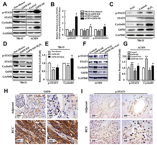 Figure 5: p-STAT3 is increased by G6PD-facilitated ROS accumulation in RCC. (A-B) Western blot assay for p-STAT3, STAT3, CyclinD1 and G6PD expression level (A) and grayscale scanning analysis (B) in 786-O and ACHN cells with stable G6PD knockdown or overexpression. (C) 786-O cells were analyzed by Western blot for p-STAT3, STAT3, CyclinD1 and G6PD expression after treatment with 20 mM NAC for 24 h or 1 mM H2O2 for 2 h. Bars represent the means ± SD from three independent experiments, each performed in triplicate. * p < 0.05 vs. 786-O-Non-silencer; # p < 0.05 vs. ACHN-Control (unpaired Student t-test). (D-G) p-STAT3, CyclinD1 and G6PD expression levels were measured by Western blot (D, F) and grayscale scanning (E, G) after treatment with 1 mM H2O2 in 786-O cells for 2 h or 20 mM NAC in ACHN cells for 24 h. Bars represent the means ± SD from three independent experiments, each performed in triplicate. * p < 0.05, ** p < 0.01 vs. Non-silencer or Control; # p < 0.05, ## p < 0.01 vs. G6PD-KD or G6PD-OE (one-way ANOVA). (H-I) Immunohistochemistry analysis for G6PD (H) and p-STAT3 (I) were performed in adjacent noncancerous renal tissues (upper row) and RCC tissues (lower row). Representative images are shown (200× and 400×).