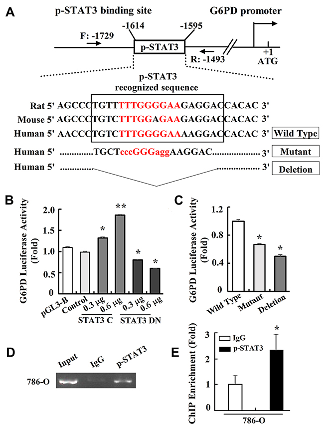 Figure 6: p-STAT3 binds directly to G6PD promoter. (A) MatInspector database analysis of the consensus binding site for p-STAT3 on the G6PD promoter. Sequences containing mutant or deleted base pairs were used to establish the G6PD-luc mutant or deletion luciferase reporter constructs. (B-C) Luciferase reporter assays of p-STAT3 transcriptional activity on the wide type (B) or mutant (C) luciferase reporter constructs were performed. * p < 0.05, ** p < 0.01 vs. Control or Wild type (one-way ANOVA). (D-E) ChIP assay was performed in 786-O cells by RCR (D) or real-time PCR (E) using anti-p-STAT3 antibody or normal IgG as a control. Data represent three independent experiments, each performed in triplicate. Bars represent the means ± SD. * p < 0.05 vs. IgG (unpaired Student t-test).