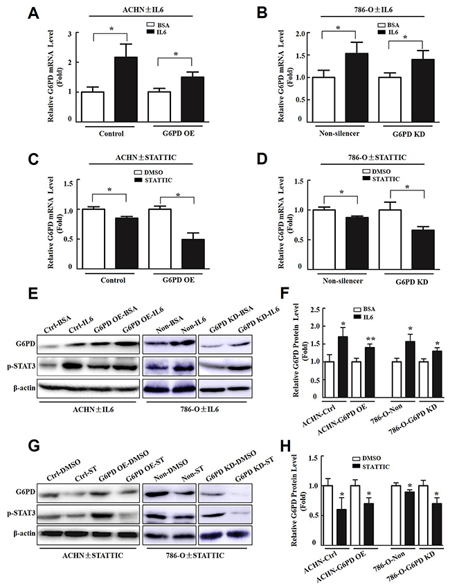To explore whether p-STAT3 is involved in G6PD up-regulation in RCC, Real-time RT-PCR and Western blot were used to analyze the impact of p-STAT3 activators (interleukin 6, IL6) or inhibitors (STATTIC) on G6PD expression. The results showed that IL6, which promoted p-STAT3 activity, increased the levels of G6PD transcription in ACHN and 786-O stable cells by about 1.5~2 folds relative to the BSA controls (Figure 7A, 7B). Whereas, the expression of G6PD at the mRNA level was notably reduced by the p-STAT3 signaling inhibitor STATTIC in both ACHN and 786-O cells (Figure 7C, 7D). Additional Western blot and grayscale scanning analyses showed that the significantly increased G6PD expression at the protein level was positively associated with the activation of p-STAT3 after treatment with IL6 (Figure 7E, 7F). Conversely, after stimulated with STATTIC, the expression of G6PD obviously decreased in RCC cells (Figure 7G, 7H). Taken together, these results show that persistent activation of p-STAT3 could act as a positive feedback regulator and lead to the aberrant transcription of G6PD in RCC.